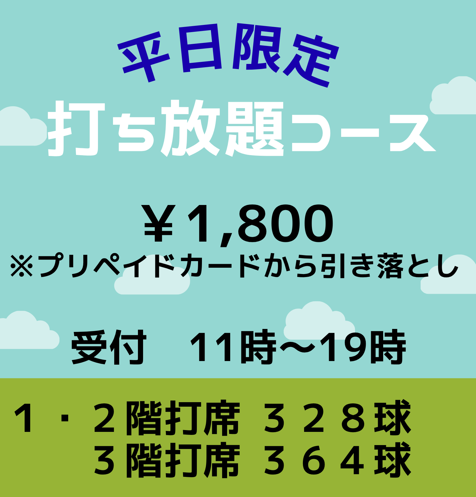 利用可能打席・・・ 1・2・3階 プリカより1,800円(税込)引き落としで328球~364球(3,600円分)まで打ち放題(時間制限なし。但し当日限り有効)