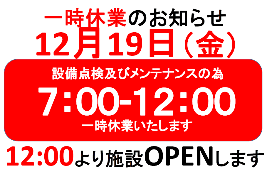 12月19日(金)午前7時~午後12時 一時休業のお知らせ