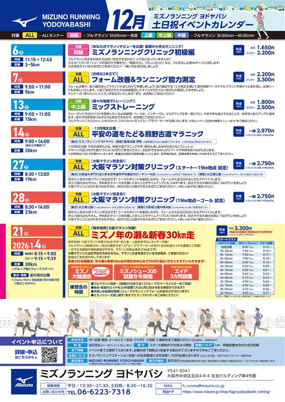 【大阪マラソン試走会も開催!】2025年12月土日クリニックスケジュール