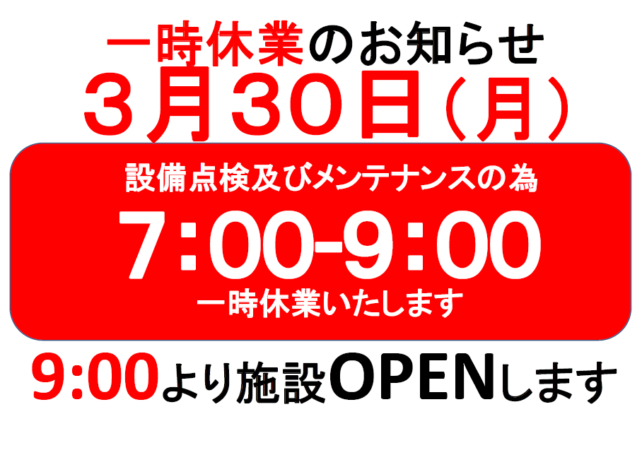 3月30日(月)午前7時~午前9時 一時休業のお知らせ
